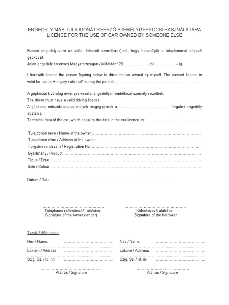Engedely Mas Tulajdonat Kepezo Szemelygepkocsi Hasznalatara